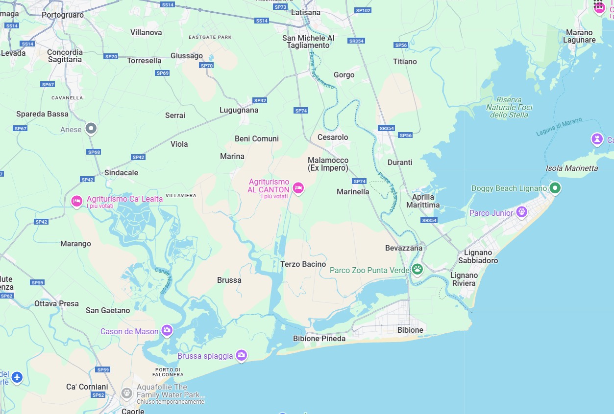 2. Provenendo da est (es. da Trieste/veneto): seguire l’autostrada A4 verso Udine/Venezia, uscita Latisana, poi SR 354 verso Lignano Sabbiadoro, imboccare lo svincolo per Aprilia Marittima, quindi Via Lignano Sud 53.